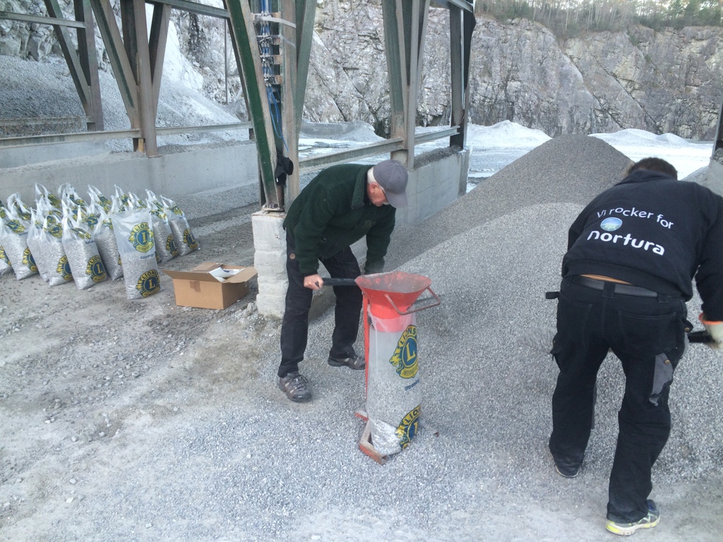 Da er vi i gang med Strøsand aktivitet Publisert av Terje Hjelmsø den 12.01.21. Første etappe gjennomført i dag på Veidekke sitt pukkverk på Lerkehaug. Egil og Harald i full aktivitet med å fylle sandsekker. Foto: Harald og Egil i full gang med å fylle strøsandsekker